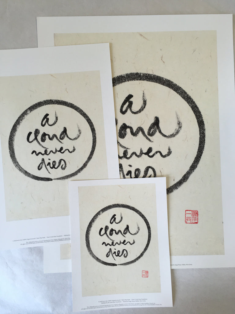 "A cloud never dies” is a print of one of many original calligraphies painted by the late Thich Nhat Hanh for Lion's Roar; they are offered here, with his blessing, as a way to support the dharma. Proceeds from the sale of the prints are shared with Thich Nhat Hanh Foundation. Thay made the calligraphies during interviews with deputy editor Andrea Miller and editor-in-chief Melvin McLeod in the early 2000s. It is a delight to be able to share them with others.