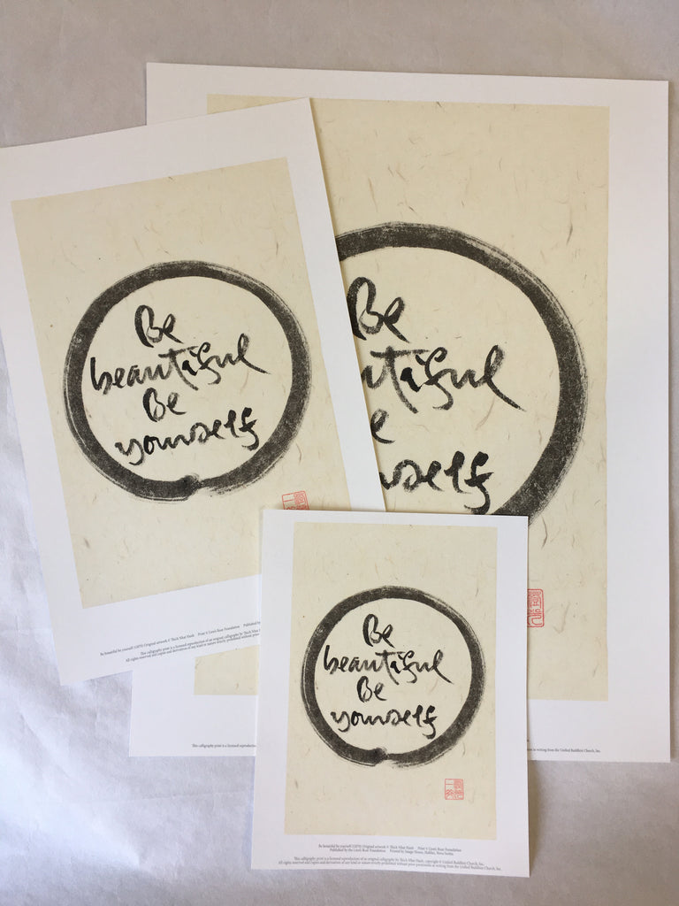 "Be beautiful be yourself” is a print of one of many original calligraphies painted by the late Thich Nhat Hanh for Lion's Roar; they are offered here, with his blessing, as a way to support the dharma. Proceeds from the sale of the prints are shared with Thich Nhat Hanh Foundation. Thay made the calligraphies during interviews with deputy editor Andrea Miller and editor-in-chief Melvin McLeod in the early 2000s. It is a delight to be able to share them with others.