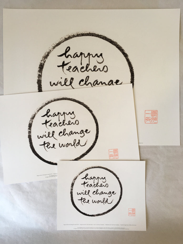 "Happy teachers will change the world” is a print of one of many original calligraphies painted by the late Thich Nhat Hanh for Lion's Roar; they are offered here, with his blessing, as a way to support the dharma. Proceeds from the sale of the prints are shared with Thich Nhat Hanh Foundation. He made the calligraphies during interviews with deputy editor Andrea Miller and editor-in-chief Melvin McLeod in the early 2000s. It is a delight to be able to share them with others.