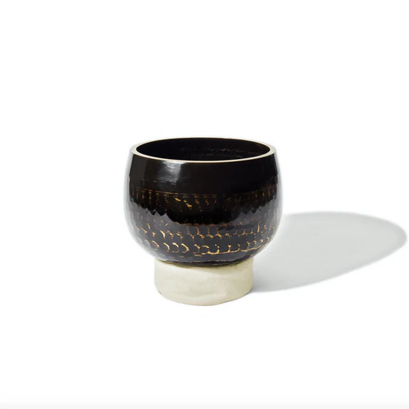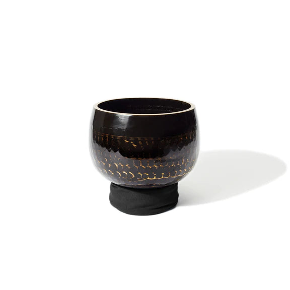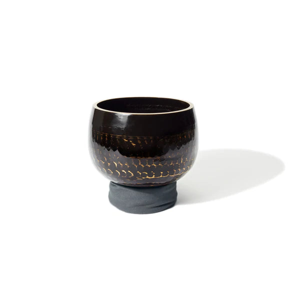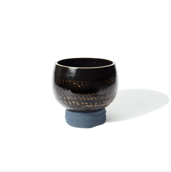This black and gold, hammered bronze mindfulness bell, 7" in diameter, supports the meditation experience through sound; bells have been used in healing applications for millennia. The bell’s peaceful tones will resonate in body and mind and add to your feeling of connection to the present moment.