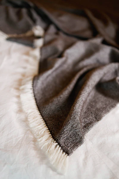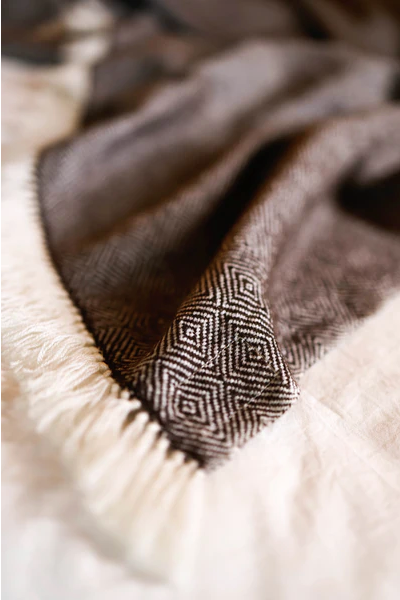 The throw is a blend of yak kullu in either ash (beige) or hazel (brown) ethically harvested from the finest part of the yak, woven together with sheep wool in its natural white color, both from the high steppes of Mongolia. The effect is warm, light, and luxurious. Both fibers are handspun and handwoven, which gives the throw its natural feel with beautiful little imperfections.