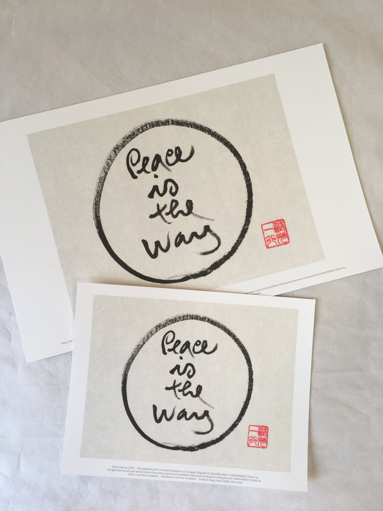 "Peace is the way” is a print of one of many original calligraphies painted by the late Thich Nhat Hanh for Lion's Roar; they are offered here, with his blessing, as a way to support the dharma. Proceeds from the sale of the prints are shared with Thich Nhat Hanh Foundation. Thay made the calligraphies during interviews with deputy editor Andrea Miller and editor-in-chief Melvin McLeod in the early 2000s. It is a delight to be able to share them with others.