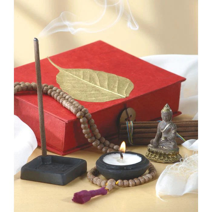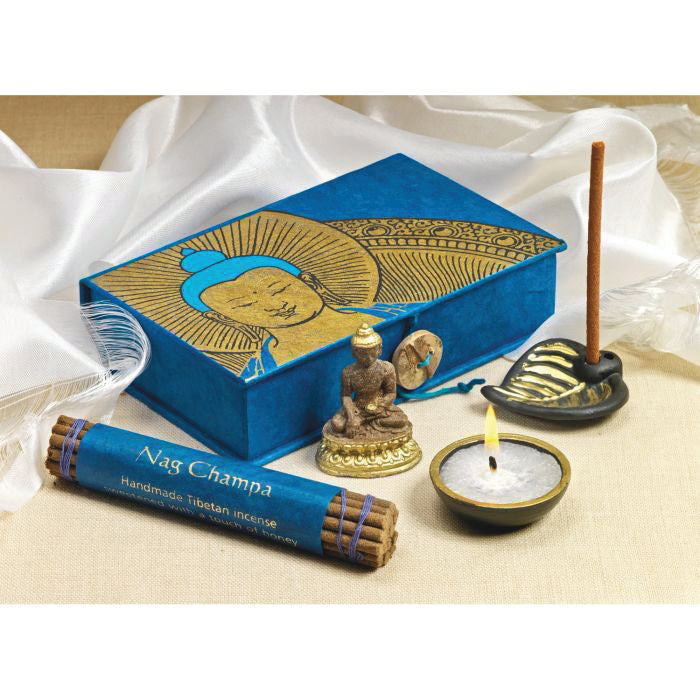 Your choice of Blue Buddha Box or Red Bodhi Leaf Box contains: a Tibetan blessing scarf or kata, a bundle of 19 aromatic incense sticks made with a traditional Tibetan herbal incense blend, ceramic incense burner, and a votive candle. All this in a beautiful eco-box made with sustainably harvested Himalayan lokta paper over recycled paper board, and with a helpful card describing the traditional use of the contents for a simple meditation practice.